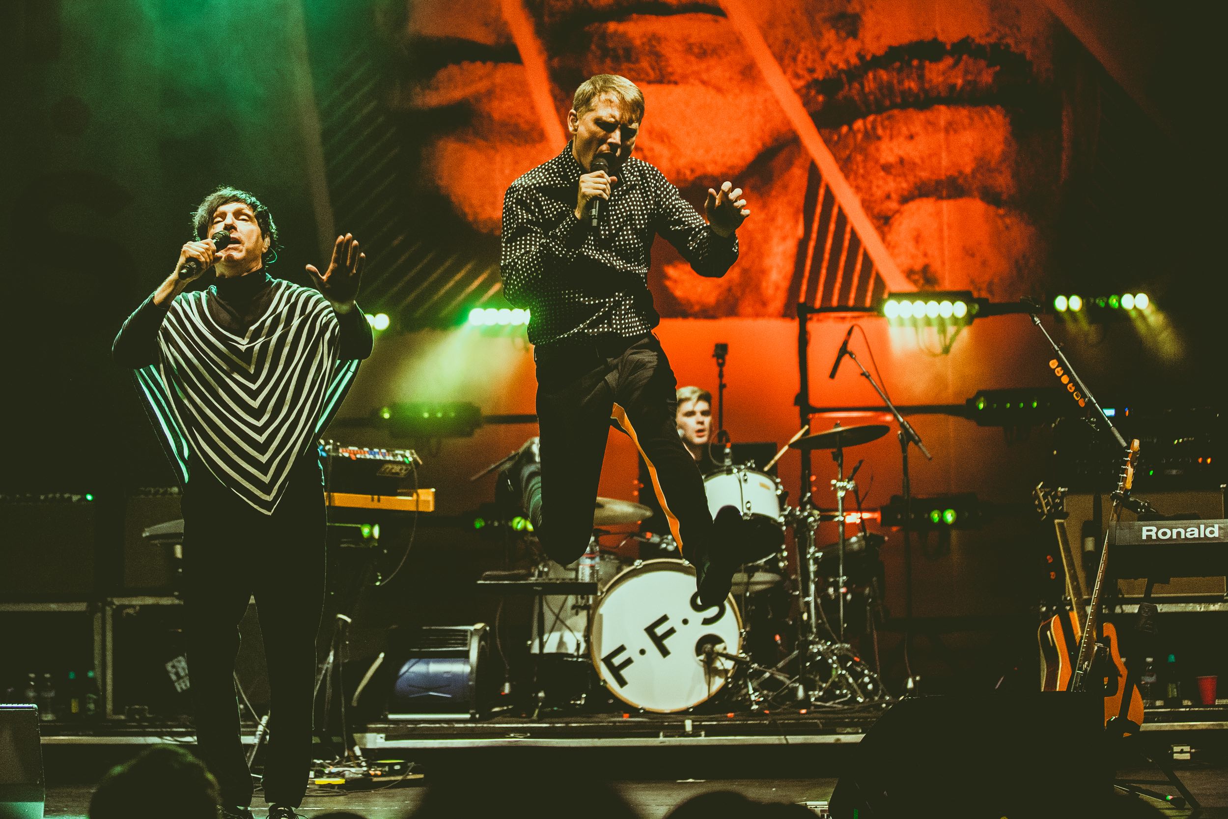 Starting out strong with “Johnny Delusional”—the grand lead single from FFS’ excellent self-titled album—it’s clear that the sextet isn’t concerned with exact choreography or dedicated stage blocking. They’re just one living and breathing music machine that’s thrilled to be performing their over-the-top baroque dance-rock jams that were born out of mutual musical admiration. The two singers relish the moments when then can duel with their distinctive voices, rushing up and down the vocal scale, blending falsettos and trading lyrics—they’re absolutely beaming as they sing the absurd lines “Paging Mr. Delusional / You’re wanted at the front desk” with the gravity of a couple of opera singers. Russell Mael—sporting a stylish turtleneck/poncho combo—has no problem keeping up with the younger McCarthy and Kapranos, who run around the stage at full speed, wielding their guitars with such frenetic energy that sometimes it seems like they’re going to explode. Actually, it’s Kapranos who has to slow down for a few numbers after appearing to twist his ankle during “Police Encounters”’ opening fanfares.